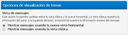 Este ajuste te permite cambiar entre la vista clásica y la nueva horizontal. La vista clásica muestra la información del autor a la izquierda del post; la horizontal muestra la información encima del mensaje.