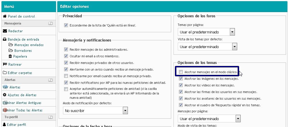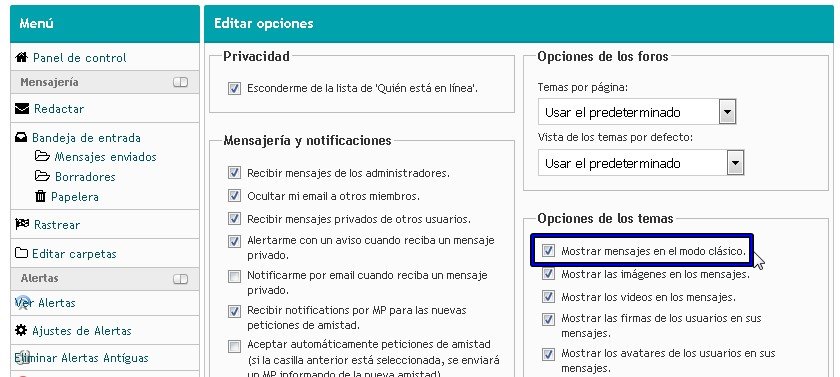 3. Vamos a Opciones de Temas y habilitamos la opción Mostrar mensajes en el modo clásico. Luego bajamos a Guardar Cambios.