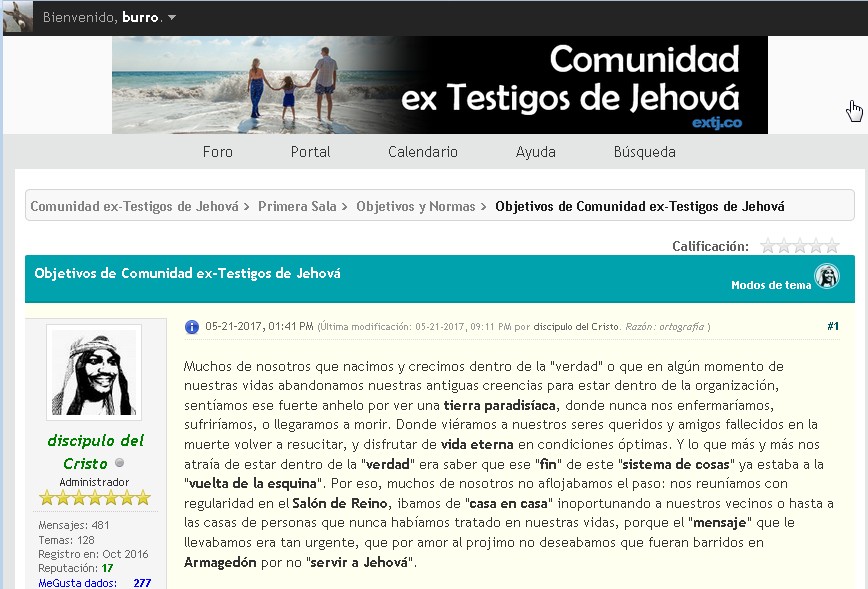 Ahora, pasando a lo importante, la verdad es que esto ha sido un gran choque para mi vida. A los 14 años empecé a asociarme, yo era hijo de una testigo expulsada, y tenia un tío tj. Él me invitó una vez a la conmemoración, de ahi me animo a ir los domingos a las reuniones, con el tiempo me empezó a hacer estudio bíblico, luego iba a las tres reuniones de ese tiempo... y mi adolescencia la pasé ligado a la "verdad". Yo me sentía feliz de hacer la voluntad de Dios, sentía que estaba donde debía estar. Todos mis planes de vida los hice pensando en seguir siendo un tj. a los 17 años dejé de ser publicador voluntariamente, porque quería probar el amor, antes de decirle "no". Tenía una amiga a quien quería mucho, andamos un tiempo, nunca tuvimos sexo, pues yo no quería fornicar. La amaba, pero en menos de un año la dejé para retomar mi camino con Jehová. Para mi, fornicar era malo, y lo que hice no era malo, pero estaba decidido a no volver a dar nisiquiera un beso en la boca a una mujer, aun si no me parecía malo, solo por la probabilidad de que a Jehová le pareciera mal. Y nunca mas pasó, aun hasta hoy, que tengo 25 años.