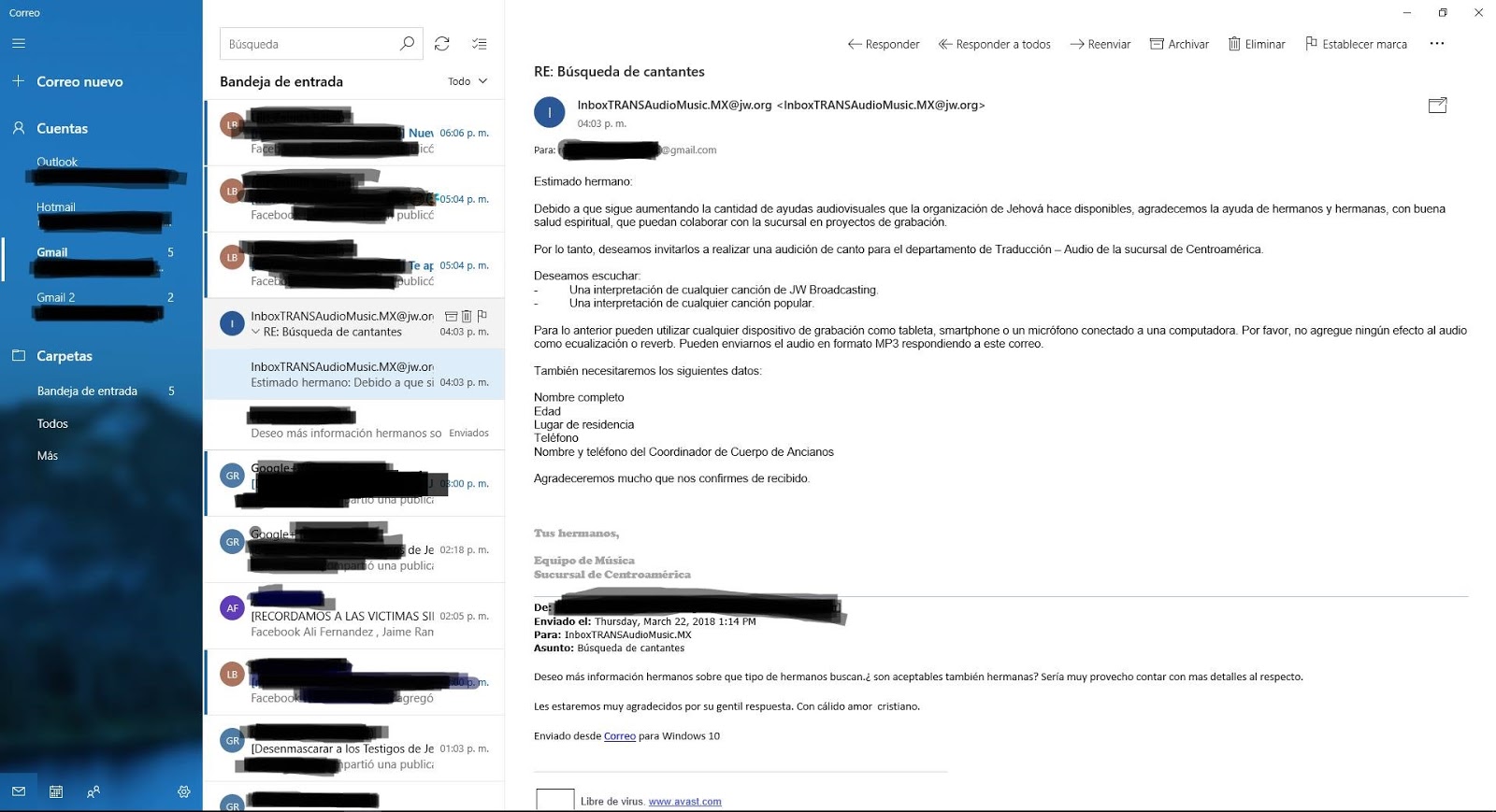 Creo que el guerrear teocrático o la edad le está pasando factura.Si usted desea corrobore si es cierto o no enviando al correo InboxTRANSAudioMusic.MX@jw.org y espere la respuesta de la organización.Y antes de emitir un juicio acusando a los exmiembros(especialmente usted amigo TH), tómese el tiempo de preguntarle a sus dirigentes...o al menos confirme si el correo ,en este caso, es verdadero y pertenece a la organización