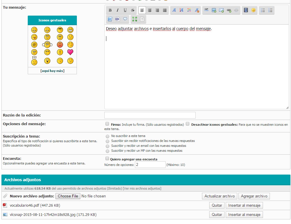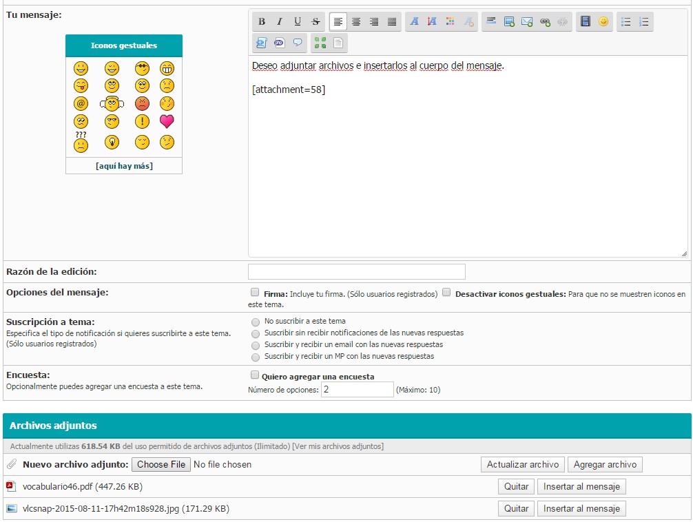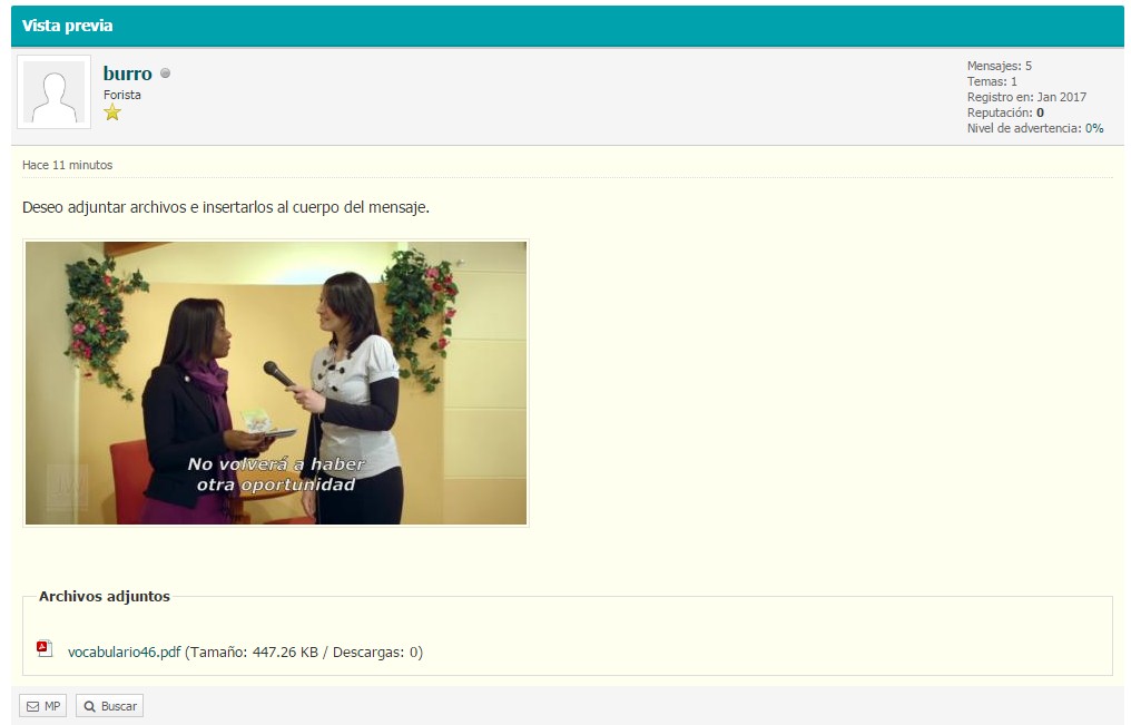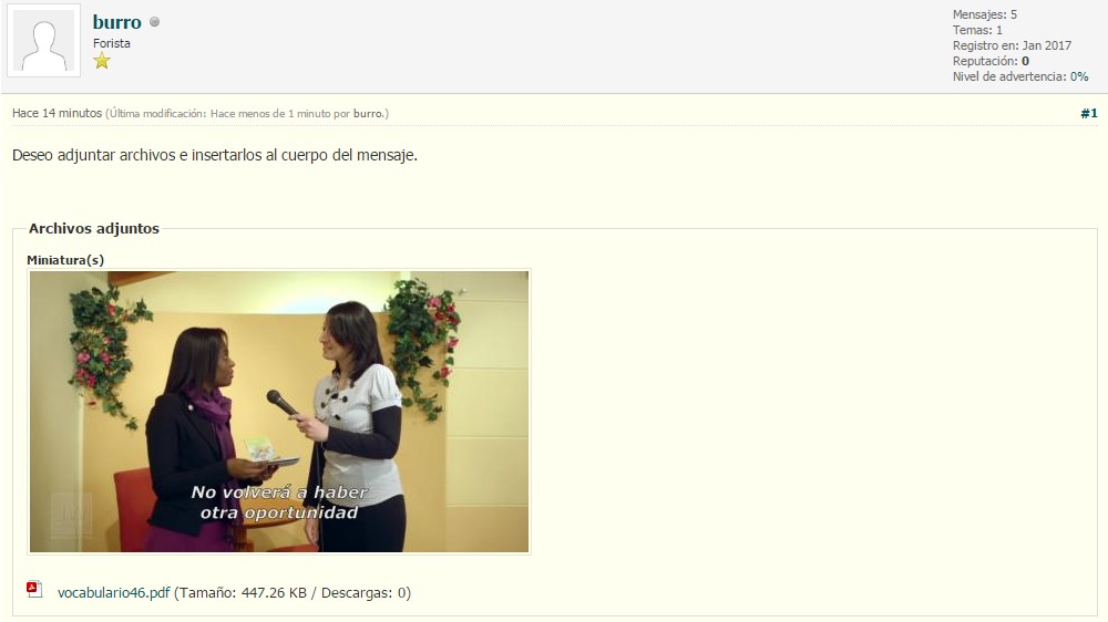 En este breve tutorial, aprenderemos a ajuntar ficheros al foro y también a insertarlos al cuerpo del mensaje del mismo. La administración solo permite 5 archivos adjuntos por mensaje. Además, antes de subir un archivo al foro, lee la siguiente norma: Normas sobre Documentos Watchtower‍ que aplica a cualquir archivo que subas al foro independientemente de la sección que lo adjuntes.